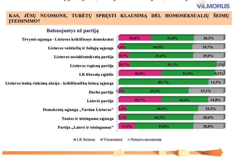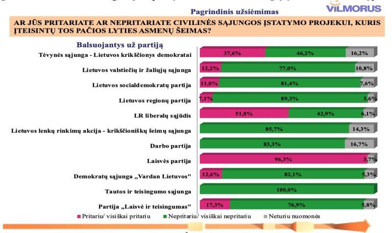 Taip pat apklausa atskleidė, jog valdžios užmačioms įteisinti homoseksualias santuokas civilinės sąjungos įstatymu pritaria toli gražu ne visi jų rinkėjai. Didžiausia dalis TS -LKD (konservatoriai) rinkėjų (46,2 proc.) teigė nepritariantys tokiam įstatymo projektui. Nuomonės išsiskyrė ir tarp Liberalų Sąjūdžio rėmėjų: 51 proc. pritaria tokiam įstatymui, beveik 43 proc. – ne. Civilinės sąjungos įstatymui valdančiųjų gretose aiškiai pritarė tik „Laisvės” partijos elektoratas.