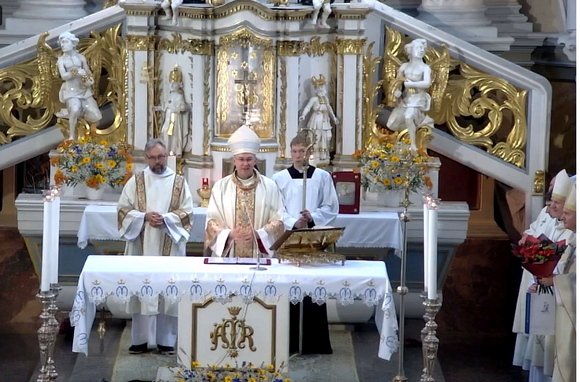Vidudienį iškilmingoje Eucharistijoje atvykusius piligrimus bei „Marijos radijo“ klausytojus pasveikino liturgijai vadovavęs arkivyskupas Kęstutis Kėvalas.