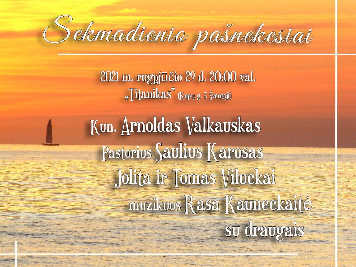 Šią vasarą Šventojoje buvo organizuojamas „Sekmadienio pašnekesių“ renginių ciklas. Užbaigiant jį didžiojoje pramogų centro „Titanikas” (Kopų g. 7, Šventoji) scenoje rugpjūčio 29 d. 20.00 val. vyks susitikimas su kariuomenės kapelionu, teologijos daktaru kun. Arnoldu Valkausku, Klaipėdos Miesto Bažnyčios pastoriumi Sauliumi Karosu, Laikmetis.lt portalo įkūrėjais Jolita ir Tomu Viluckais. Muzikuos Rasa Kauneckaitė su draugais.