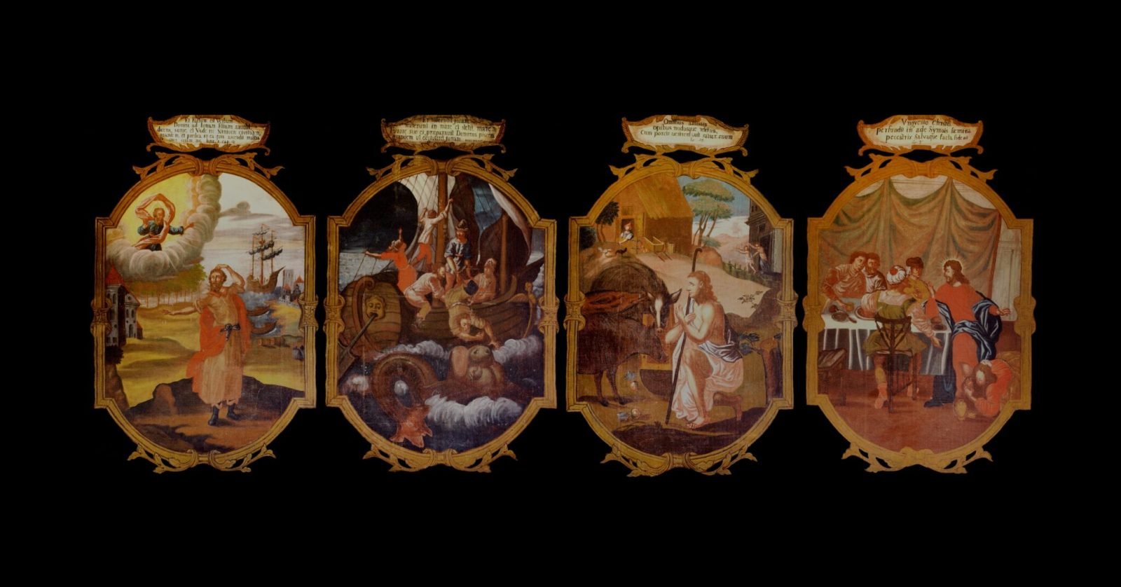Pirmoje parodos dalyje eksponuojamas Švėkšnos bažnyčios paveikslų ciklas. Paveikslai, dabar paskiri, iš pradžių sudarė didžiulį (apie 320 x 850 cm) vientisą ar kelis didelius tapinius; buvo sukomponuoti po du, vienas virš kito, o XIX a. viduryje sukarpyti.