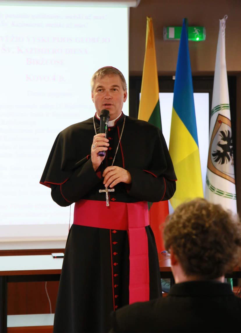 Sveikinimo žodį tarė Panevėžio vyskupas Linas Vodopjanovas OFM. Ganytojas pasidžiaugė, kad įsteigus Panevėžio vyskupiją, jos globėju buvo paskirtas šv. Kazimieras, nes jis – pirmasis lietuvių šventasis, iškeltas į altoriaus garbę už ypatingai skaistų ir sąžiningą krikščionišką gyvenimą.