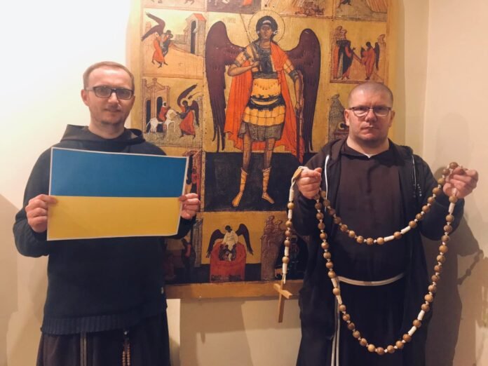 „Su mūsų ginklu rankose prie šv. arkangelo Mykolo ikonos mūsų koplyčioje kovojame už Ukrainą”, – savo būrį sekėjų informuoja Paulių kapucinų vienuolyno broliai.