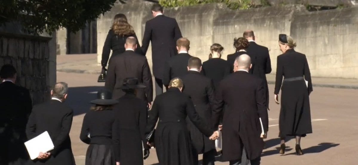 Iš paskos taip pat ėjo vaikaičiai princai 38 metų Williamas (Viljamas) ir 36-erių Harry (Haris), nors jiedu nėjo greta. Kaip numatė protokolas, tarp brolių, kurių santykius aptemdė Harry sprendimas atsisakyti karališkųjų pareigų ir persikelti gyventi į Kaliforniją, ėjo jų pusbrolis 43-ejų Peteris Phillipsas (Piteris Filipsas), princesės Ann sūnus.