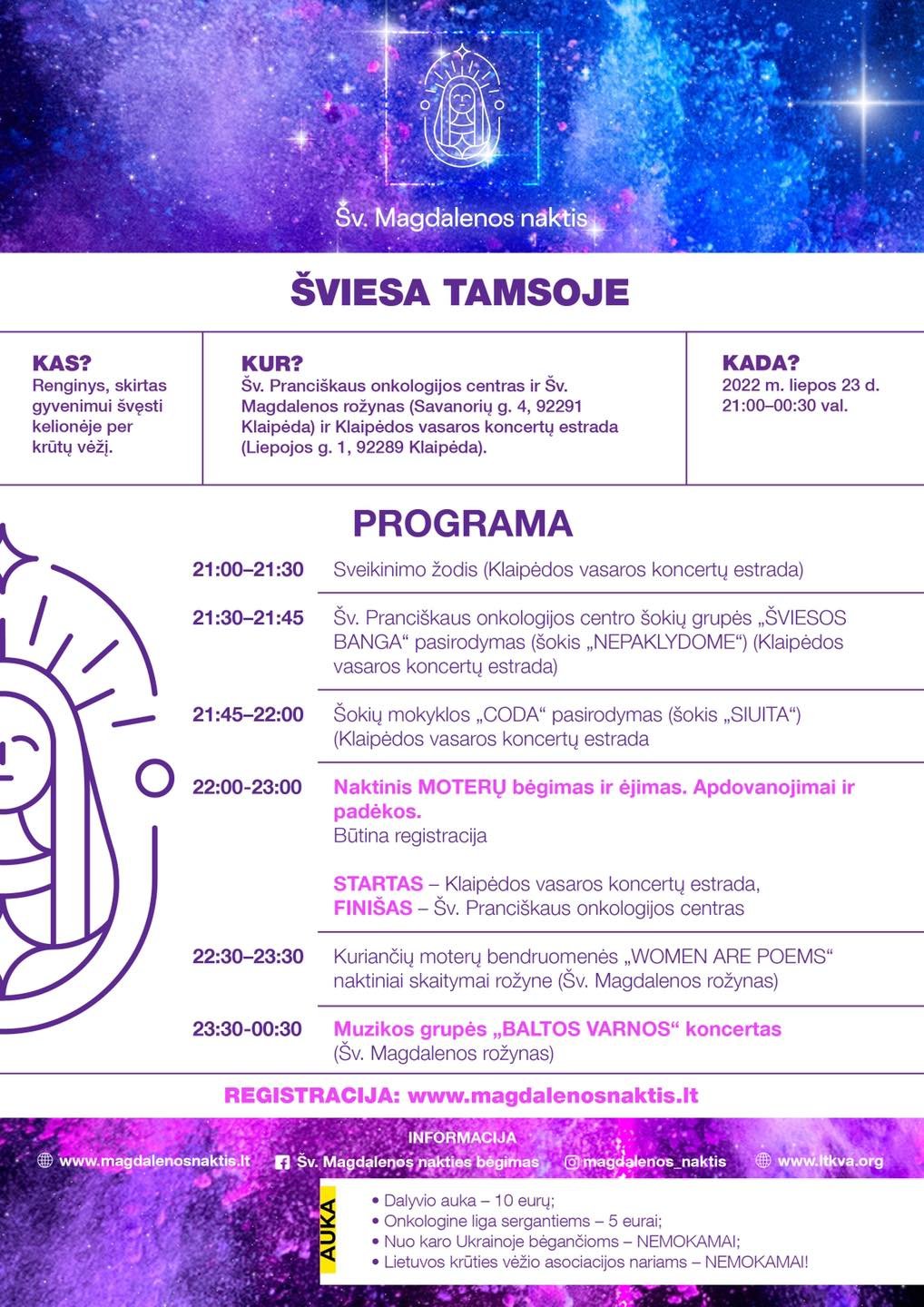 Liepos 23 d. jau ketvirtąsyk Klaipėdoje levandomis pakvips Šv. Magdalenos naktis. Tai – Lietuvos krūties vėžio asociacijos (www.ltkva.org) kartu su MBO Lietuvos Šv. Kazimiero Provincijos Klaipėdos Šv. Pranciškaus Asyžiečio Vienuolyno broliais, Šv. Pranciškaus Vilties miestu, Šv. Pranciškaus onkologijos centru, Klaipėdos miesto savivaldybe, Klaipėdos universitetu bei didžiosiomis Lietuvos ligoninėmis rengiamas projektas, skirtas krūties vėžio žinomumui didinti.