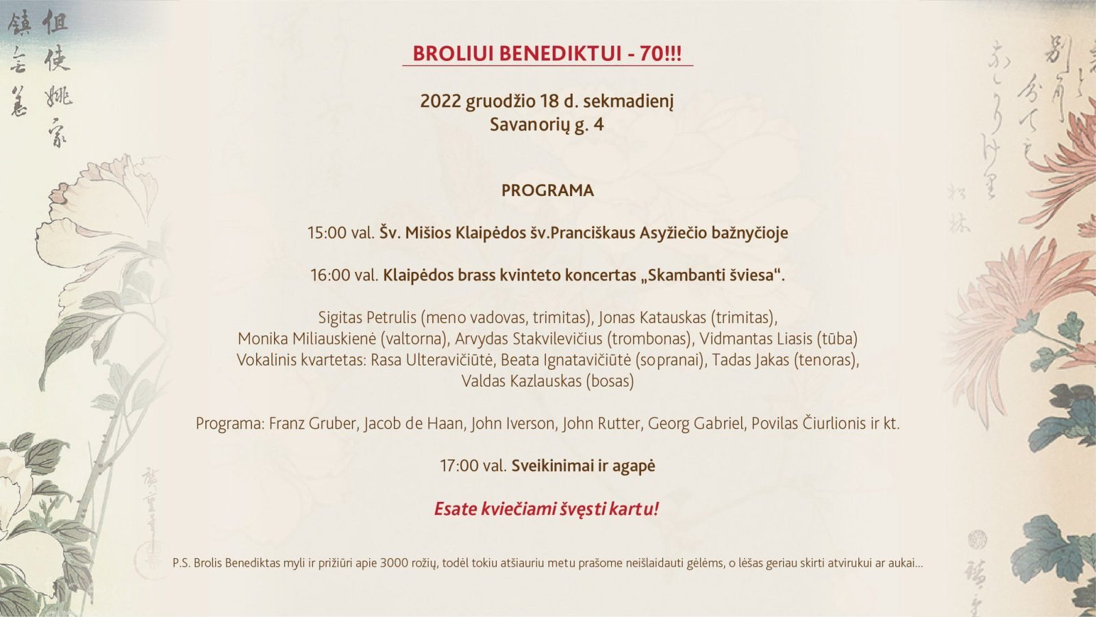 „Maloniai kviečiame į brolio Benedikto Sigito Jurčio 70-ies metų paminėjimą gruodžio 18 d., sekmadienį, Klaipėdos šv. Pranciškaus Asyžiečio bažnyčioje, Savanorių g. 4, Klaipėda”, – rašoma pranešime.