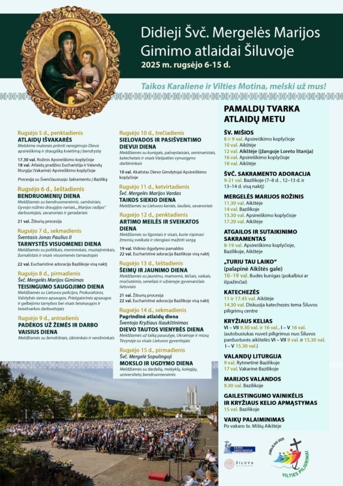 REIKALINGA JŪSŲ PARAMA RENGINIŲ ANONSAI Didieji Švč. Mergelės Marijos Gimimo atlaidai Šiluvoje 2025 08 25 13:36 65 Dalintis FacebookLinkedinTelegramViberWhatsAppTwitterEmailSpausdinti: Dalintis FacebookLinkedinTelegramViberWhatsAppTwitterEmailSpausdinti: Ankstesnis straipsnisNacionalinė konferencija „Kaip nesunaikinti laisvės ir demokratijos: Šiluvos deklaraciją apmąstant?”Kitas straipsnisPiligriminis žygis už taiką, santarvę ir vienybę pasaulyje SUSIJĘ STRAIPSNIAI Kauno sporto halėje – jau ketvirtą kartą vyksiantis Velykų koncertas „Prisikėlęs“2026 03 17 14:56 Konferencija „terraCREAToris: vaizduotė, kūryba, dvasingumas“2026 03 13 15:44 Mokslinė praktinė konferencija „Žmogaus gyvybės ir orumo neatsiejamumo principas medicinoje“2026 03 08 22:27 REKOMENDUOJAME Krikščionių profsąjunga tęsia „LKB Kronikos“ misiją REKLAMA PARAMA NAUJAUSI Energetikos ministras įpareigojo „Orlen Lietuvą“ nedelsiant į rinką paleisti rezervinius degalus Kauno sporto halėje – jau ketvirtą kartą vyksiantis Velykų koncertas „Prisikėlęs“ Mirė ilgametis evangelikų liuteronų kunigas Liudvikas Fetingis Valdantieji ieško priemonių degalų kainų amortizavimui Karo Persijos įlankoje kronika, nukautas Irano nacionalinio saugumo vadas JAV prezidentas Donaldas Trumpas: man teks garbė paimti Kubą Krikščionių profsąjunga tęsia „LKB Kronikos“ misiją Būtume dėkingi, jei mus paremtumėte PARAMA