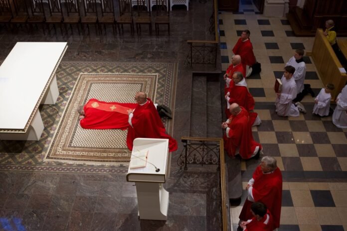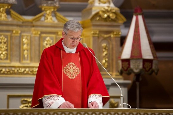 Pirmasis liturgijos gestas buvo pati nuolankiausia malda – arkivyskupas Kęstutis Kėvalas meldėsi tylomis, guldamas ant grindų priešais altorių. Šitaip galėtume įsivaizduoti Jėzaus maldą Alyvų kalne prieš nukryžiavimą, galbūt šitaip į maldą Tėvui buvo sudėtas maldavimas, kad kančia būtų atitolinta, – panašiai kaip šiandien to norime melsti pasauliui, kur nerimsta jau įsiliepsnoję ir įsižiebia nauji kariniai konfliktai, kur daug kančios, skausmo, nežinios.