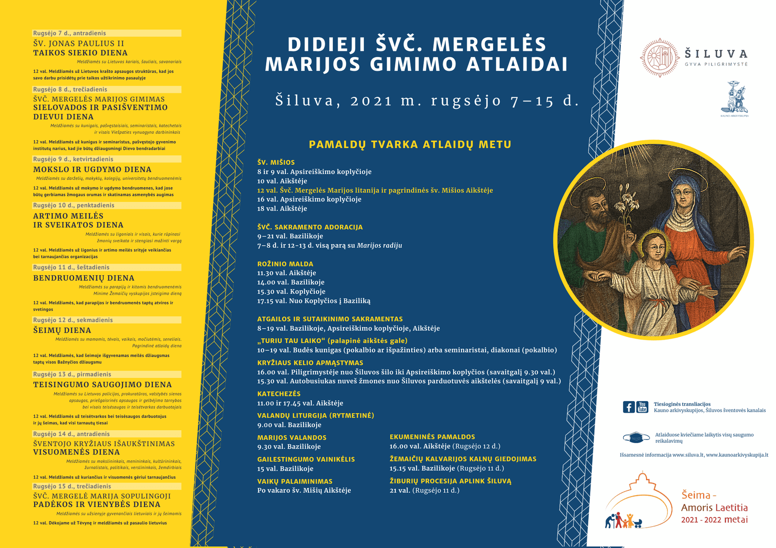 Rugsėjo 7 – 15 d. Šiluvos piligriminėje šventovėje švenčiame didžiųjų Švč. Mergelės Marijos Gimimo atlaidų (Šilinių) aštuondienį. Šiemet švenčiamais Šeimos – Amoris Laetitia ir Šv. Juozapo metais pagrindinė Šilinių diena – rugsėjo 12-osios sekmadienis – skiriamas šeimoms meldžiantis intencija, kad šeimoje išgyvenamas meilės džiaugsmas taptų visos Bažnyčios džiaugsmu. Tą patį sekmadienį 16 val. Šiluvos aikštėje bus švenčiamos Ekumeninės pamaldos.