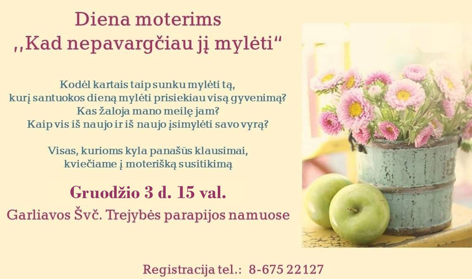 Garliavos Švč. Trejybės parapija gruodžio 3 d. 15 val. moteris kviečia dalyvauti susitikime, kurio metu bus kalbama apie santykius su vyru, meilę, ištinkančias problemas ir santuoką apskritai.