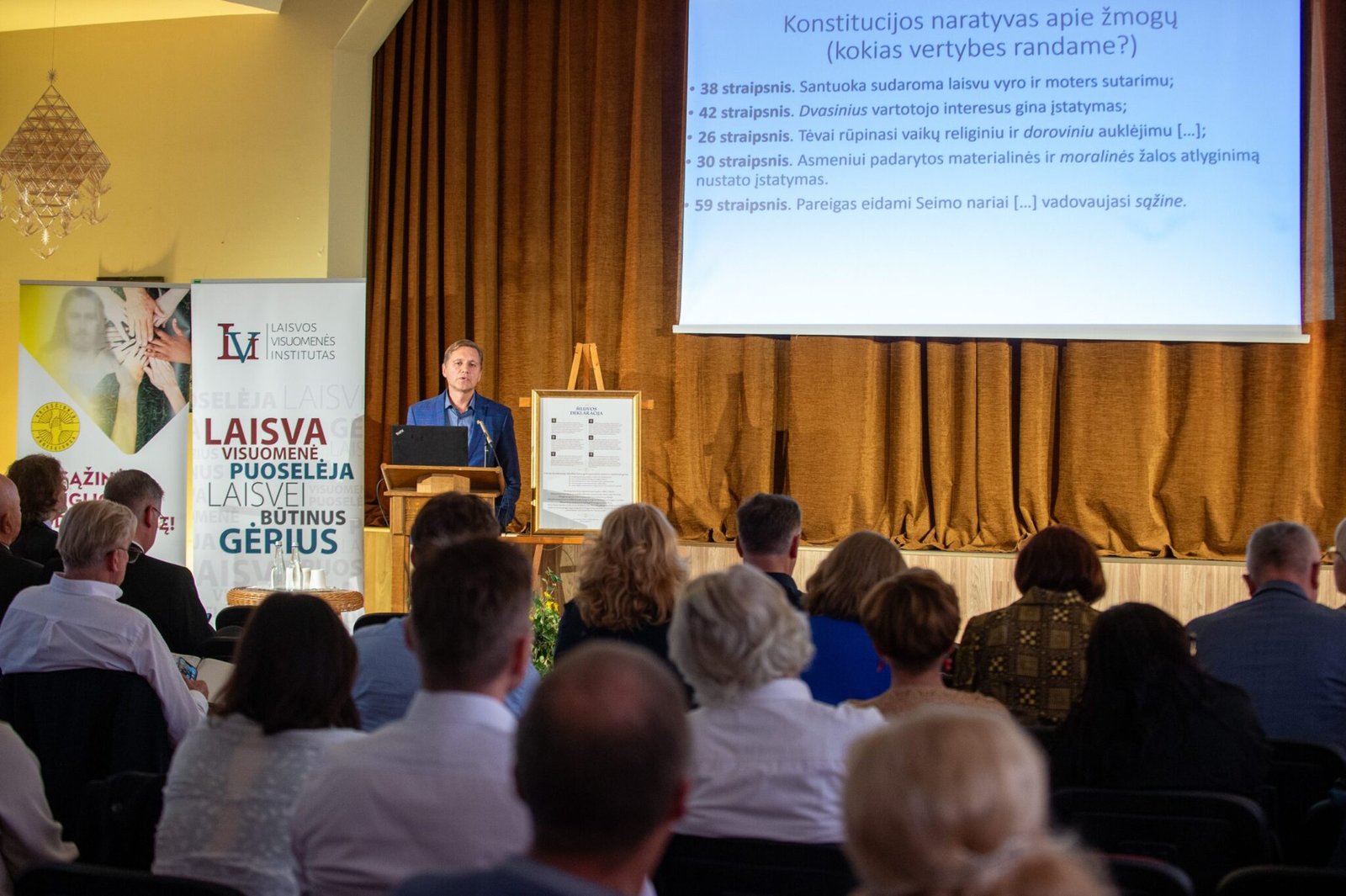 Prieš pradedant kalbėti apie sąžinės laisvę ar kitas žmogaus teises, visų pirma, galime savęs paklausti, ką Konstitucija sako apie žmogų, kaip jį supranta? Pavyzdžiui, Konstitucijos 38 straipsnis teigia: santuoka sudaroma laisvu vyro ir moters sutarimu; 42 straipsnis: dvasinius vartotojo interesus gina įstatymas; 26 straipsnis: tėvai rūpinasi vaikų religiniu ir doroviniu auklėjimu […]. 30 straipsnis: asmeniui padarytos materialinės ir moralinės žalos atlyginimą nustato įstatymas; 59 straipsnis: pareigas eidami Seimo nariai […] vadovaujasi sąžine… Tiesa, kartais sakoma, kad Seimo nariai neturi sąžinės, tuo tarpu Konstitucija ne tik sako, kad Seimo nariai turi sąžinę, bet ir daro prezumpciją, kad jie vadovaujasi savo sąžine. Aišku, čia galėtume paklausti, kodėl vadovavimasis savo sąžine Konstitucijoje siejamas tik su Seimo nariais?…