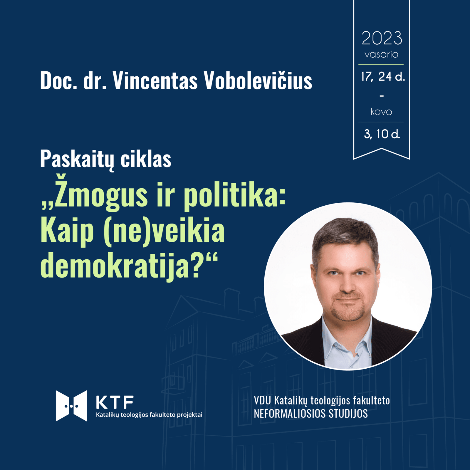 VDU Katalikų teologijos fakultetas (neformaliosios studijos) pristato paskaitų ciklą tema „Žmogus ir politika: kaip (ne)veikia demokratija?”. Paskaitas ves doc. dr. Vincentas Vobolevičius, ISM Vadybos ir ekonomikos universiteto, Ekonomikos ir politikos programos vadovas.