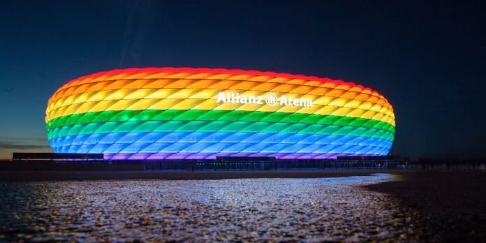 Keli kiti Vokietijos stadionai, kuriuose nevyks futbolo čempionatas „Euro 2020“, pranešė nušvisiantys vaivorykštės spalvomis.