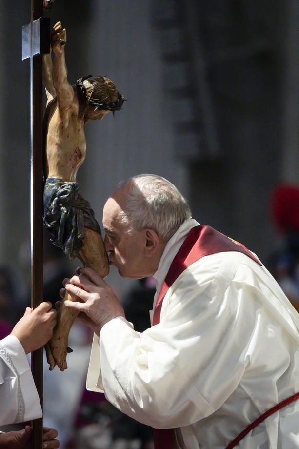 Didžiojo penktadienio pavakare popiežius Pranciškus Šv. Petro bazilikoje vadovavo Kristaus kančios pamaldoms. Jų centre – evangelisto Jono pasakojimas apie paskutines Jėzaus žemiškojo gyvenimo valandas ir mirtį ant kryžiaus. Šią dieną homiliją Šv. Petro bazilikoje sako ne popiežius, bet jo namų pamokslininkas. Vėliau vakarą vyko Kryžiaus kelias prie Romos Koliziejaus.