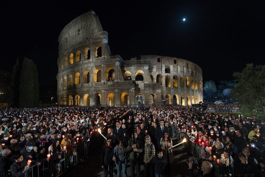 Vėliau, Didžiojo penktadienio, vakarą popiežius Pranciškus vadovavo Kryžiaus keliui prie Romos Koliziejaus.