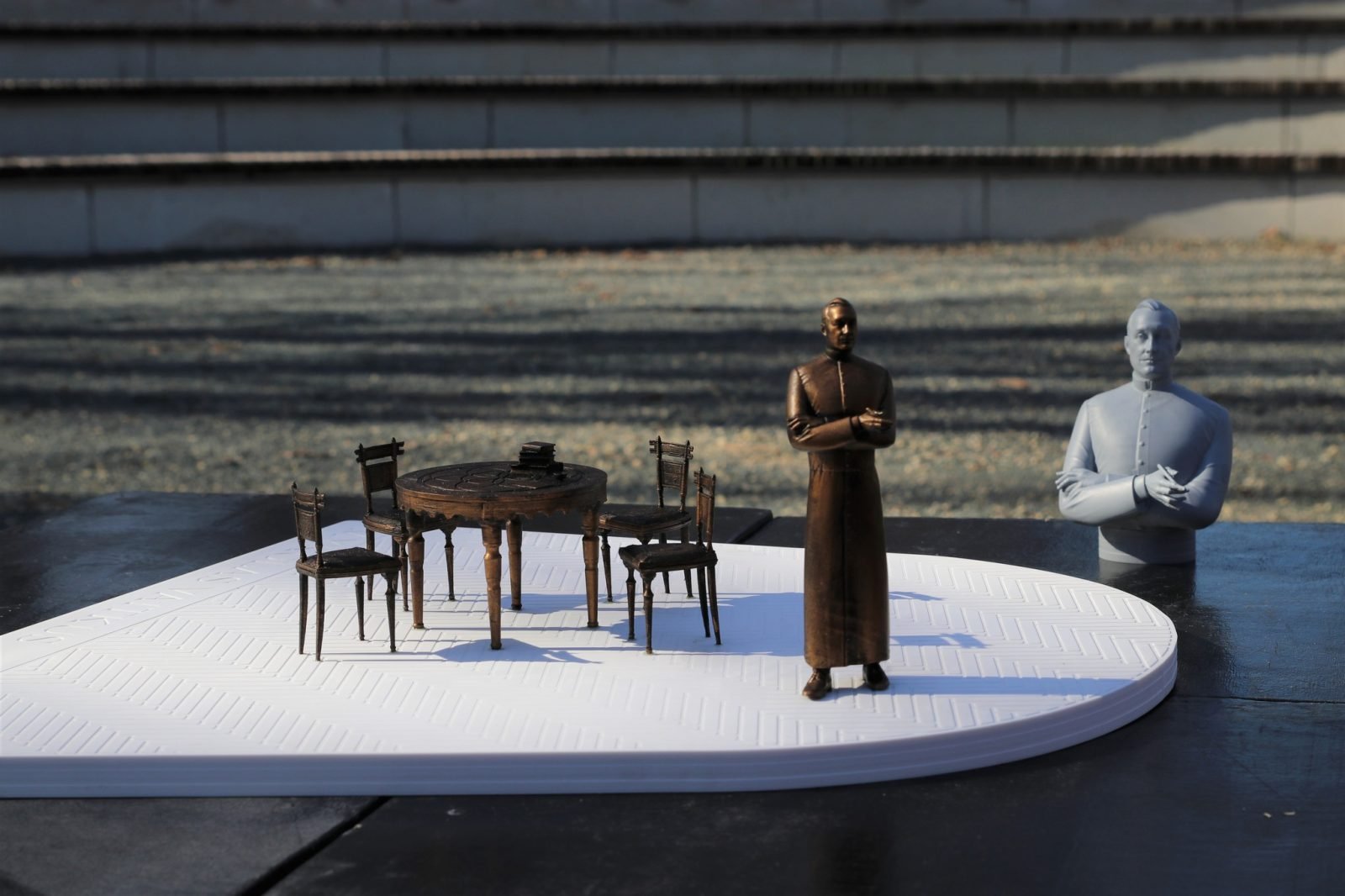 Kompoziciją sudarys stovinčio M. Vaitkaus skulptūra, apvalus stalas ir prie jo pastatytos keturios tuščios kėdės.