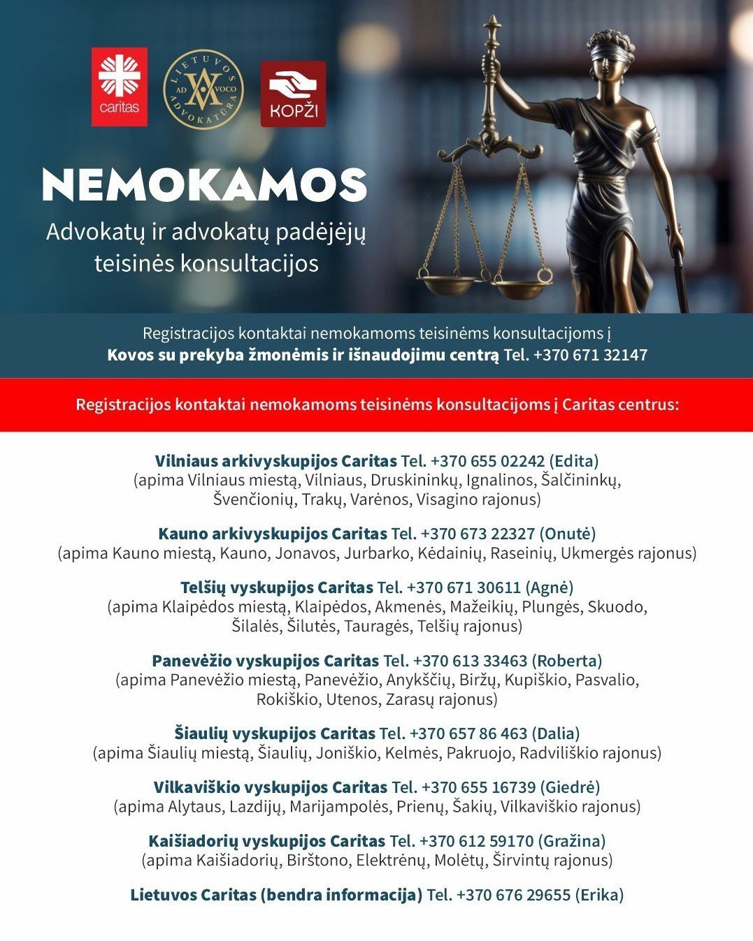 Registracijos kontaktai nemokamoms teisinėms konsultacijoms į Caritas centrus: