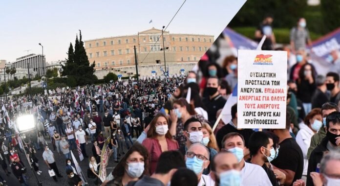 „Šalin rankas nuo 8 valandų (darbo dienos)”, – skelbė užrašas ant vieno iš plakatų, kuriuos nešė prokomunistiniai protestuotojai Atėnuose.