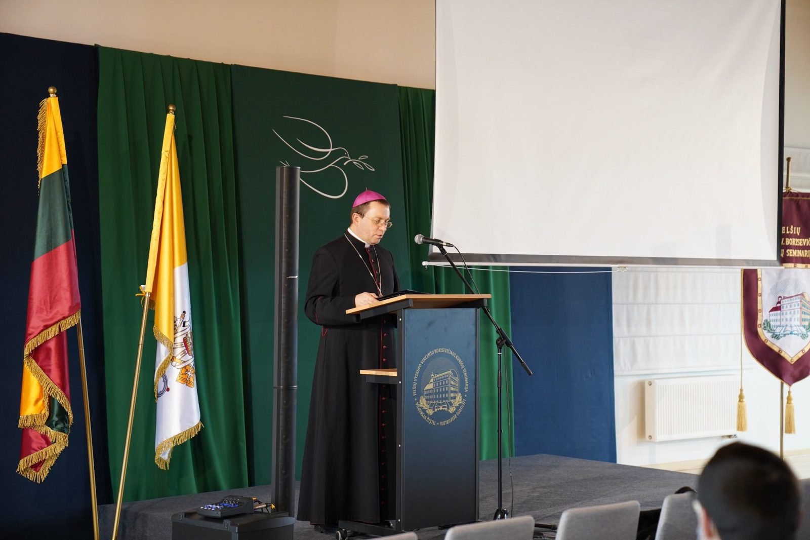 Po bendros maldos susirinkusiesiems pranešimą skaitė Tauragės dekanato dekanas, Tauragės parapijos klebonas kun. bažnytinės teisės daktaras Marius Venskus.