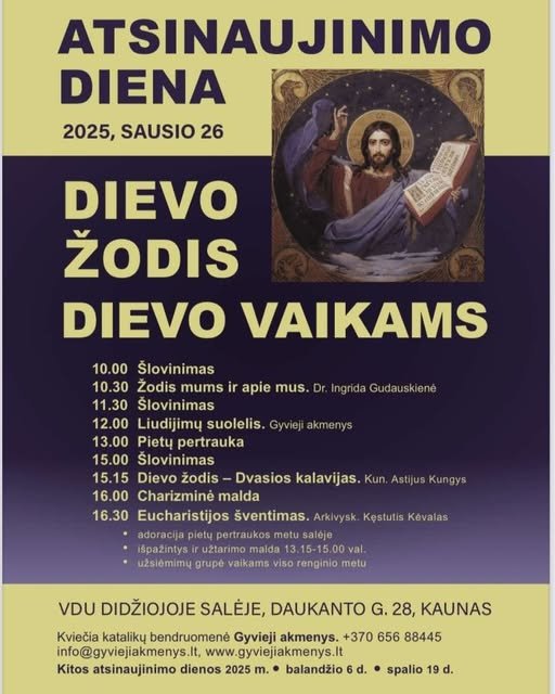 Sausio 26 dieną, sekmadienį, katalikų bendruomenė „Gyvieji akmenys“ kviečia į Atsinaujinimo dieną Kaune, pavadintą „Dievo žodis Dievo vaikams“. Renginys atviras visiems norintiems.