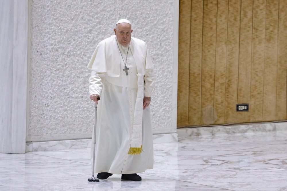 Popiežius Pranciškus šeštadienį suklupo įeidamas į Vatikano audiencijų salę, kai nulūžo jo lazdos rankena, tačiau išvengė kritimo.