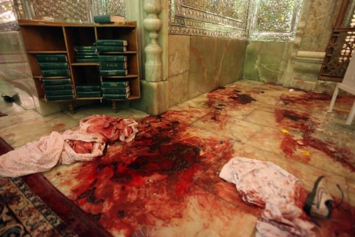 Irano žiniasklaida paskelbė nuotraukų ir vaizdo įrašų, kuriuose matyti šventovės viduje gulintys uždengti kruvini kūnai.