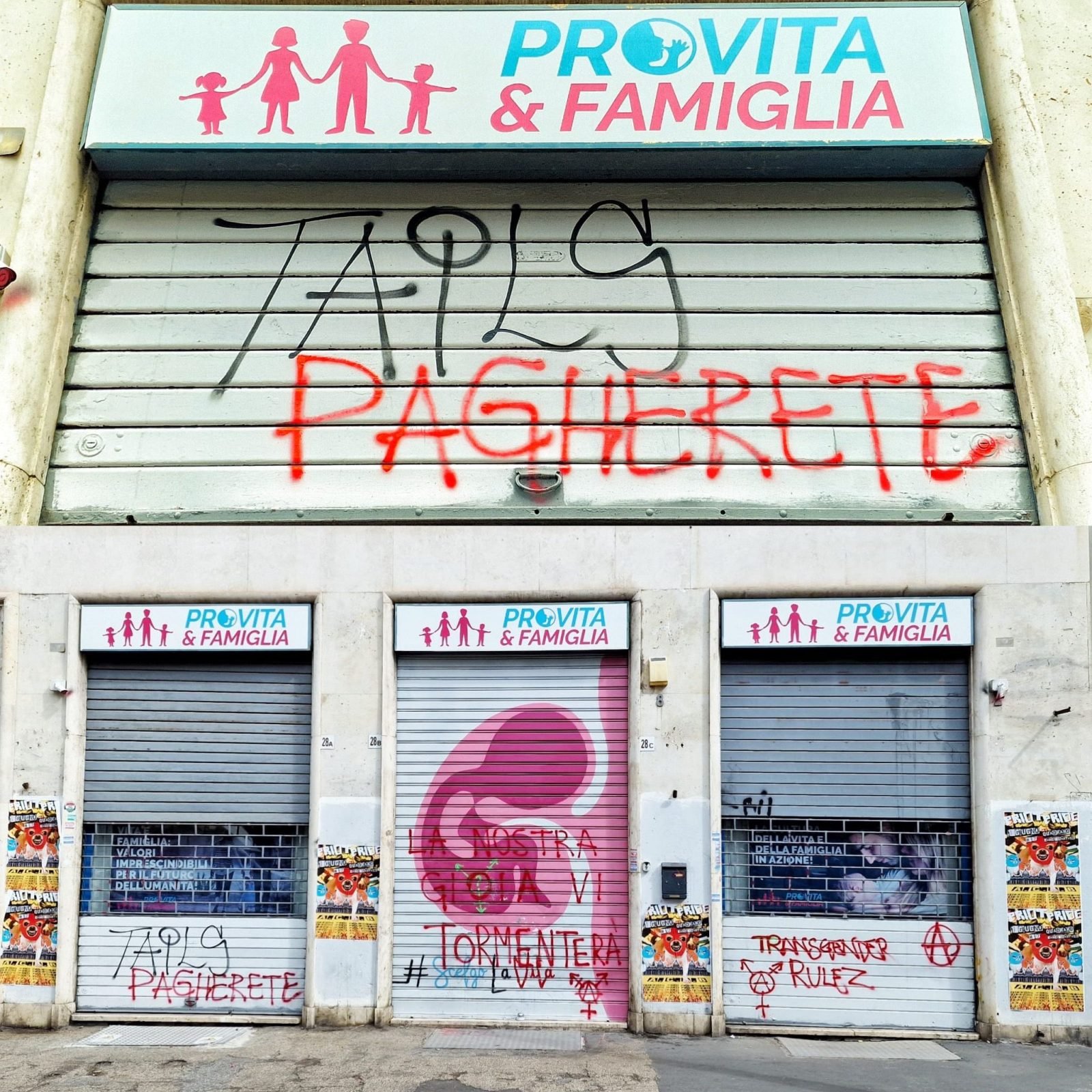 „Praėjusią naktį Romoje esanti nacionalinė „Pro Vita & Famiglia“ būstinė dvyliktą kartą per mažiau nei trejus metus buvo išniekinta. Paskutinis išpuolis buvo įvykdytas vos prieš 10 dienų. Vis aiškesnius grasinimus („Jūs sumokėsite“, „Mes jus kankinsime“, „Mes neduosime jums ramybės“) socialinėje žiniasklaidoje skelbė LGBTXYZ kolektyvas, kuris iš pradžių stebėjimo kameras užtamsino raudonais dažais – tais pačiais, kuriais buvo išteptos langinės, o paskui iškabino 15 plakatų, kuriuose pavaizduota liepsnojanti Palestinos vėliava, plevėsuojanti virš Šv. Petro bazilikos, ir šūkis „Queers for Palestine“, – pasakojama organizacijos feisbuko įraše.