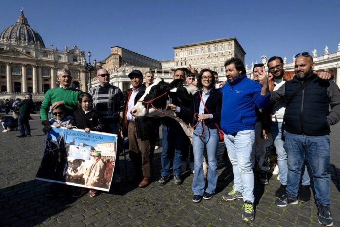 Italijos ūkininkai, kurie šiemet yra tarp 2025 m. Jubiliejaus vilties piligrimų, penktadienį atvežė savo gyvulius į Vatikaną, kad kardinolas Mauro Gambetti (Mauras Gambetis) juos palaimintų.