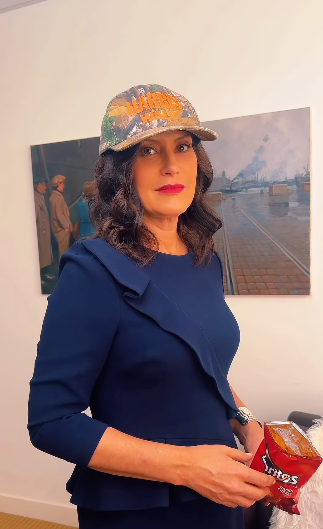 Whitmer žvelgia į kamerą dėvėdama Kamalos Harris kamufliažinio dizaino kepuraitę, po to, kai pamaitina klūpančią Plank „Nacho Cheese Dorito“, kurią Harris dažnai apibūdina kaip savo mėgstamiausią užkandį.