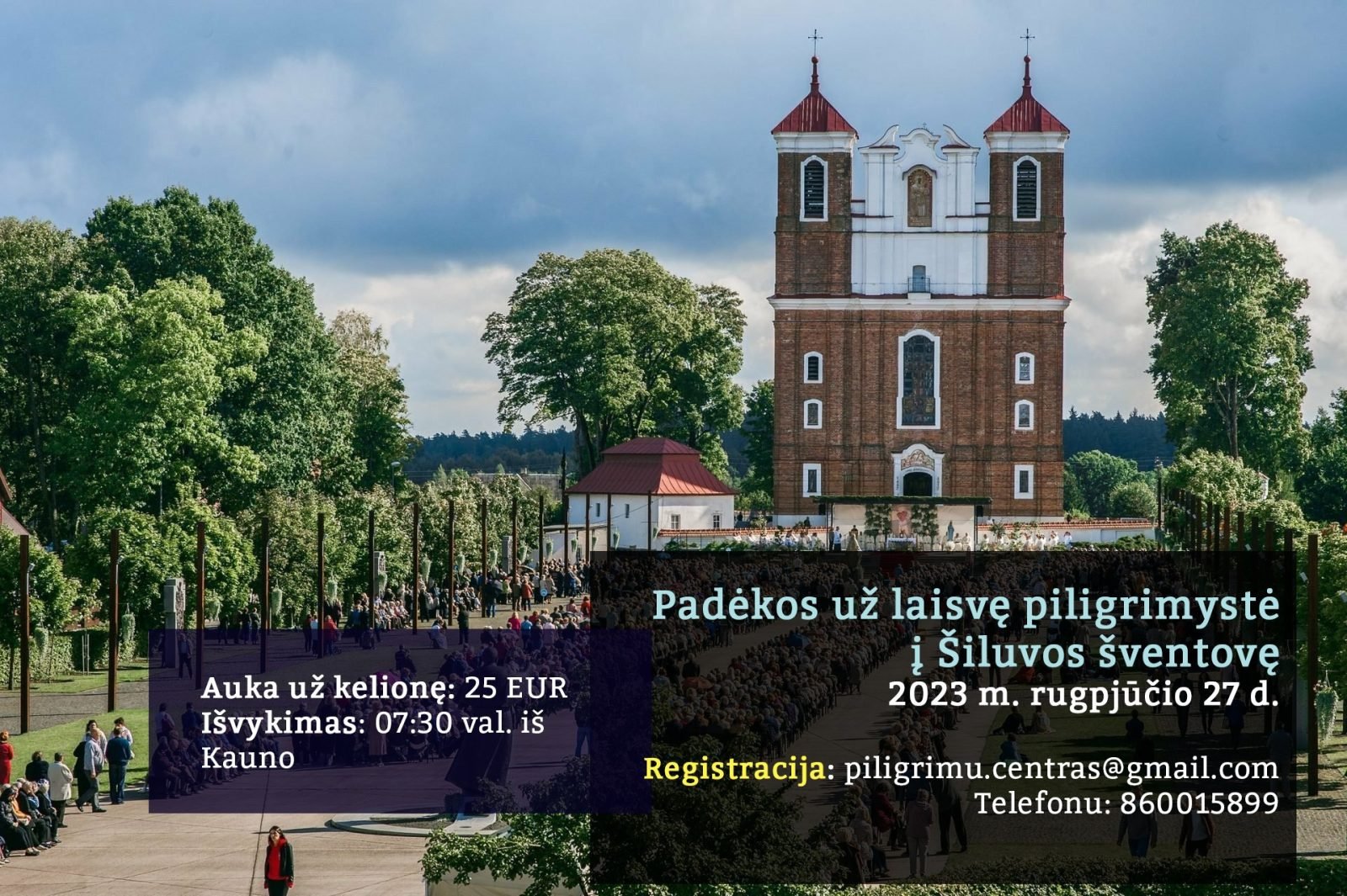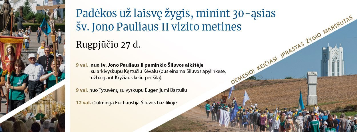 „Paskutinį vasaros sekmadienį, rugpjūčio 27d., Šiluvoje švęsime tradicinę Padėkos už laisvę šventę. Šią dieną bus organizuojamos dvi piligriminės eisenos – padėkos už laisvę žygis minint 30-ąsias šv. Jono Pauliaus II vizito Lietuvoje metines. Dėmesio! Keičiasi eisenos įprastas maršrutas (eisime ne nuo Katauskių gyvenvietės).
