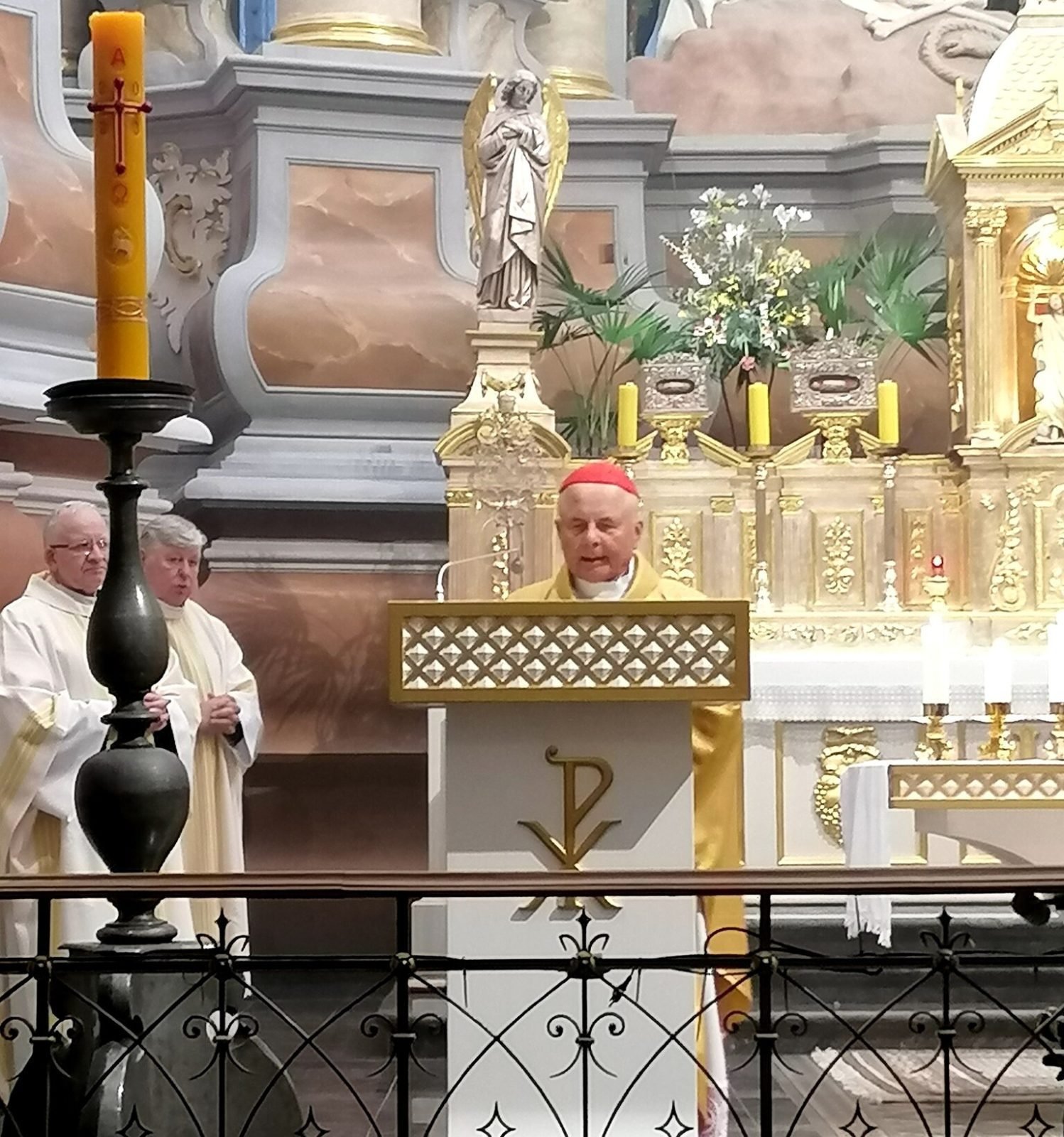 Eucharistijos liturgijai vadovavęs kardinolas Sigitas Tamkevičius SJ savo homilijoje atkreipė dėmesį į skaitinį iš Apaštalų darbų (Apd 17) apie apaštalą Paulių, kuris Areopage skelbia apie tikrąjį Dievą – Prisikėlusį Kristų. Tačiau tik kai kurie atėniečiai priima Pauliaus skelbimą ir tampa pirmaisiais Bažnyčios nariais. Kitiems Prisikėlimo žinia lieka svetima.