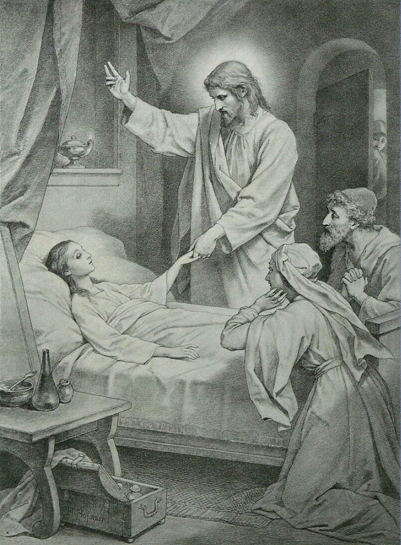 Evangelistas Morkus pasakoja apie pirmuosius Jėzaus stebuklus: Jajiro dukrelės prikėlimą iš numirusiųjų ir ilgai sirgusios moters pagydymą. Evangelistas pastebi, kad Jėzus pagydydavo tik tuomet, kai nelaimėje esantis žmogus tikėjo ir pasitikėjo juo. Nelaiminga moteris palietė Jėzaus drabužį tikėdama: „Jeigu paliesiu bent jo drabužį – išgysiu!“ (Mk 5,28). Jėzus pagyrė moters tikėjimą: „Dukra, tavo tikėjimas išgelbėjo tave, eik rami ir būk išgijusi iš savo ligos“ (Mk 5,34). Sinagogos vyresnysis Jajiras karštai maldavo: „Mano dukrelė miršta! Ateik ir uždėk ant jos rankas, kad pagytų ir gyventų“ (Mk 5,23). Kai žmonės pranešė, kad dukrelė jau mirusi, Jėzus nuramino tėvą: „Nenusigąsk, vien tikėk!“ (Mk 5,36).
