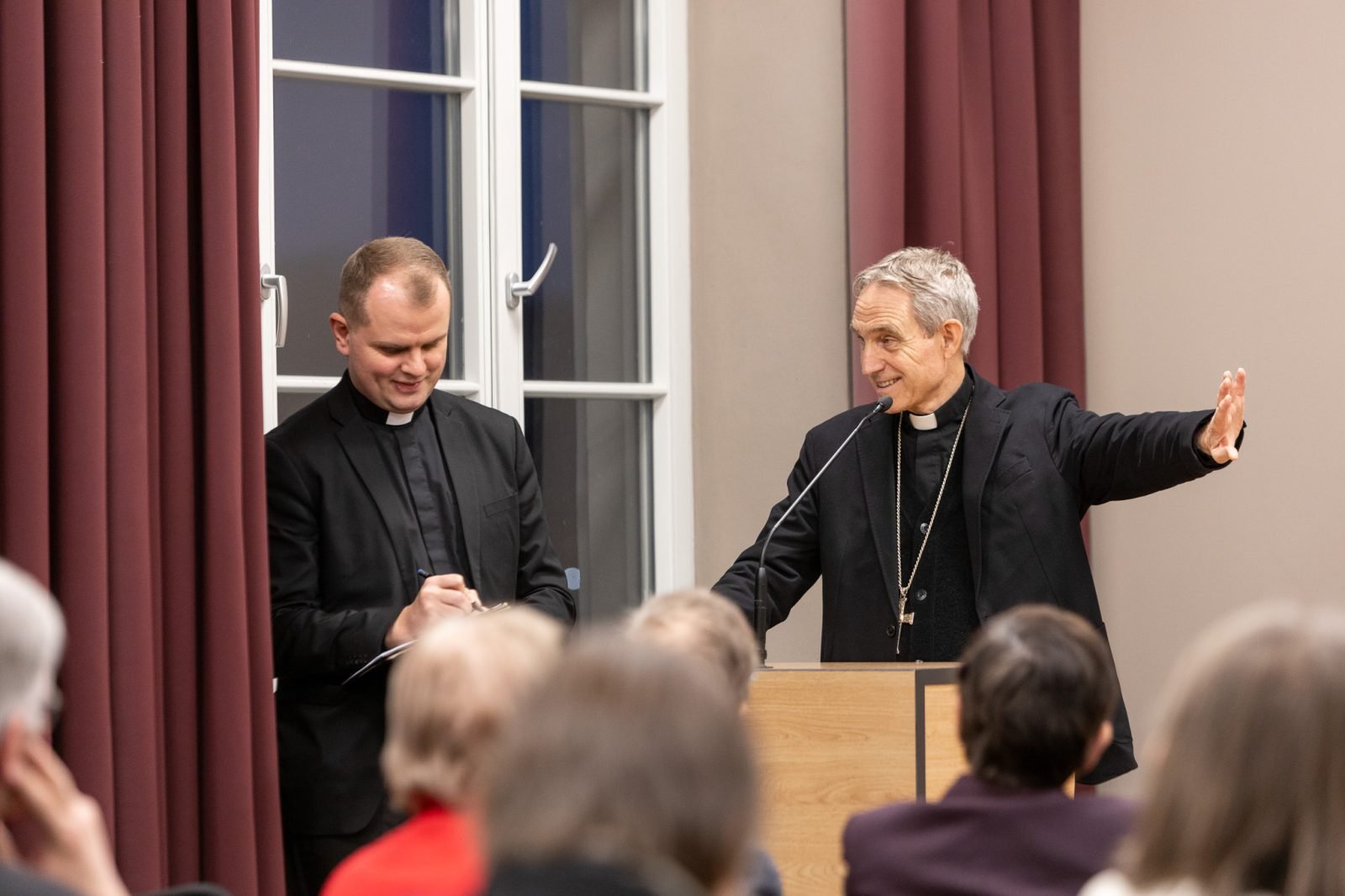 Arkivysk. G. Gänsweinas savo kalbą pradėjo prisistatydamas ir papasakodamas savo kunigiškos tarnystės istoriją, kurioje ryškūs Dievo vedimo ženklai. Didžiausias dėmesys buvo skirtas popiežiui Benediktui XVI, kurio asmeniniu sekretoriumi buvo arkivyskupas G. Gänsweinas. Prelegentas popiežių Benediktą XVI apibūdino trimis žodžiais: nuolankus, nepaprastai intelektualus, maldos bei tikėjimo žmogus.