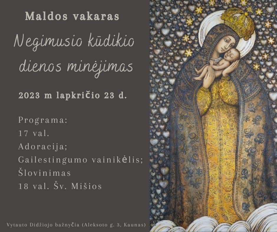 Kauno arkivyskupijos Šeimos centras kviečia paminėti Negimusio kūdikio dieną (lapkričio 23-iąją) malda Kauno Švč. Mergelės Marijos Gimimo (Vytauto Didžiojo) bažnyčioje, praneša Kauno arkivyskupijos Šeimos centras.