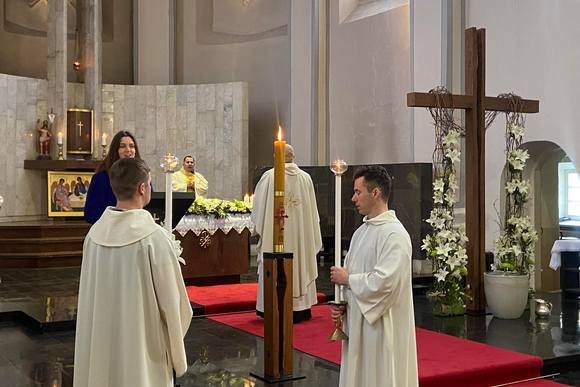 Kartu švęstos šv. Mišios, kurias aukojo kunigas Peteris Hertelis, koncelebravo Kauno kunigų seminarijos rektorius kunigas Liutauras Vilėniškis. Kunigas Peteris homilijoje atkreipė dėmesį, kad prisikėlęs Jėzus pirma pasirodė Marijai Magdalietei ir siuntė ją pranešti visiems. Tačiau ja niekas nepatikėjo, nes tais laikais Izraelyje moterys negalėjo būti liudininkės teismų bylose; tai turėdavo būti 2 vyrai. Taigi po to Jėzus siuntė paliudyti 2 vyrus, bet ir jais nepatikėjo. Tad Jis galiausiai pasirodė pats ir jau neliko priežasčių netikėti Prisikėlimu. Vienas žmogus sakė, kad per šv. Velykas nepatikusi kažkurio kunigo homilija, nes joje nebuvo nieko naujo. O kun. Peteris liudijo, kad jam nereikėjo išgirsti nieko naujo, nes buvo svarbu matyti iš kalbančiojo kunigo, kad Kristus tikrai prisikėlė.