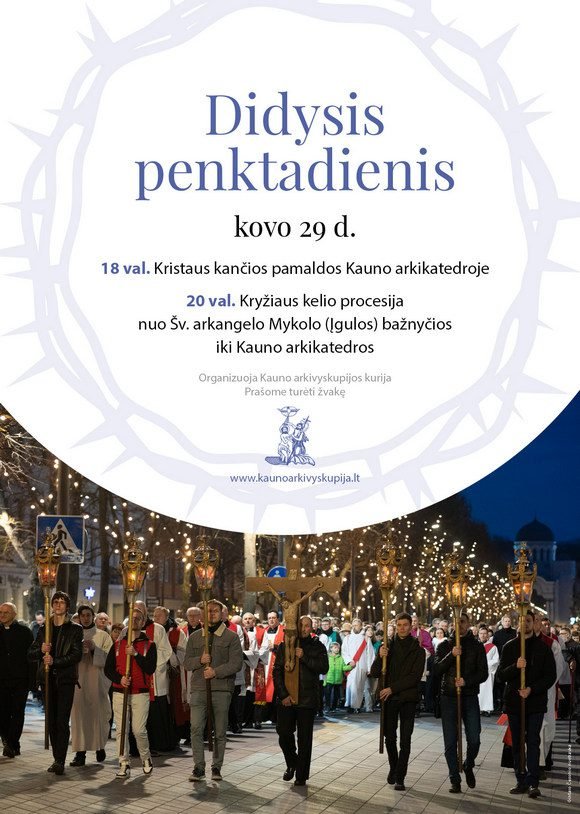 Didžiojo penktadienio vakarą Kauno arkivyskupijos kurija kviečia į Kryžiaus kelio procesiją Kauno gatvėmis. Ji prasidės po Kristaus Kančios pamaldų 20 val. nuo Šv. arkangelo Mykolo (Įgulos) bažnyčios.