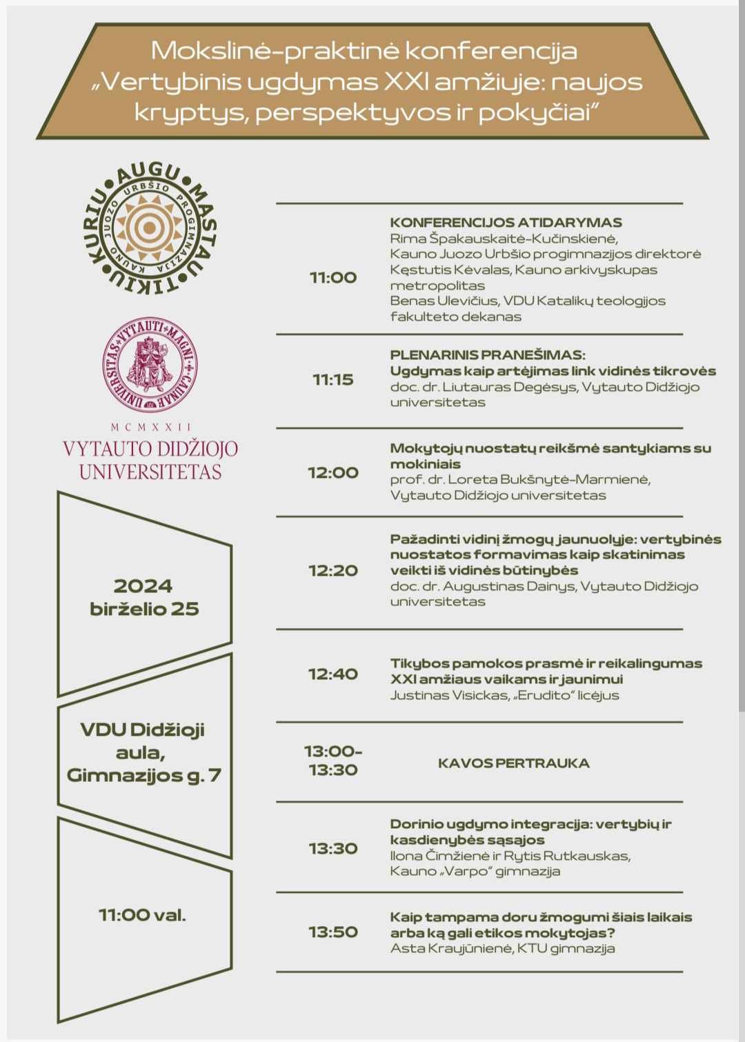 Birželio 25 d. 11 val. Vytauto Didžiojo universiteto Didžiojoje Auloje (Gimnazijos g. 7) vyks mokslinė-praktinė konferencija „Vertybinis ugdymas XXI amžiuje: naujos kryptys, perspektyvos ir pokyčiai“ (nemokama).