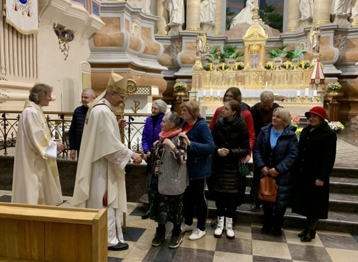 Į vakaro šv. Mišias su CARITO bendradarbiais lapkričio 15-ąją Benamystės dienos centro lankytojai atėjo su savo užrašytais maldavimais, kurie buvo atnešti prie altoriaus Kauno arkikatedroje.