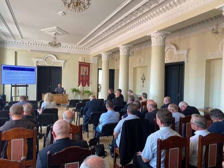Pasibaigus šv. Mišioms kunigų susirinkimas tęsėsi arkivyskupijos kurijoje. Čia aptartos sielovados aktualijos, o prieš jas išklausytas kunigo dr. Nerijaus Pipiro pranešimas apie Dievo tarnus arkivyskupą kankinį Mečislovą Reinį (1884–1953) bei Eleną Spirgevičiūtę (1924–1944) artėjant jos gimimo 100-mečiui.