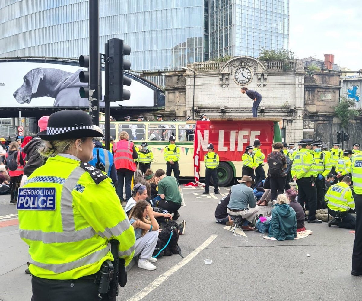 Vėliau protestuotojai pajudėjo į Londono centrą ir susirinko prie Mokslo muziejaus, kur policija susirėmė demonstrantais ir keletą jų sulaikė.