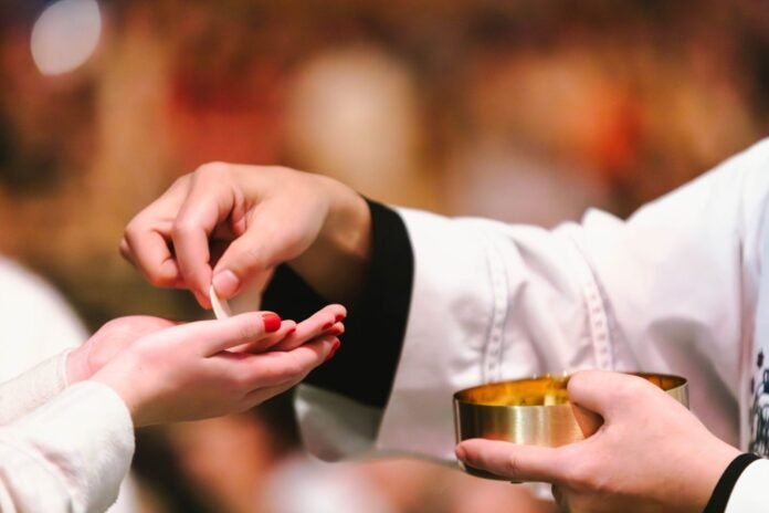 Katalikų Bažnyčios katekizmo Nr. 1355 teigiama: „Komunijos metu, sukalbėjus Viešpaties maldą ir sulaužius duoną, tikintieji gauna „duoną, nužengusią iš dangaus“, ir „išganymo taurę“ – „už pasaulio gyvybę” (Jn 6, 51) save atidavusio Kristaus Kūną ir Kraują.”