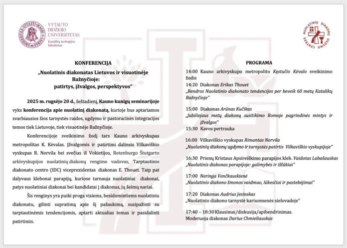 Rugsėjo 20 dieną (šeštadienį), Kauno kunigų seminarijoje vyks konferencija apie nuolatinį diakonatą. Konferencijoje bus aptariamos svarbiausios šios tarnystės raidos, ugdymo ir pastoracinės integracijos temos Lietuvos ir pasaulio kontekste.
