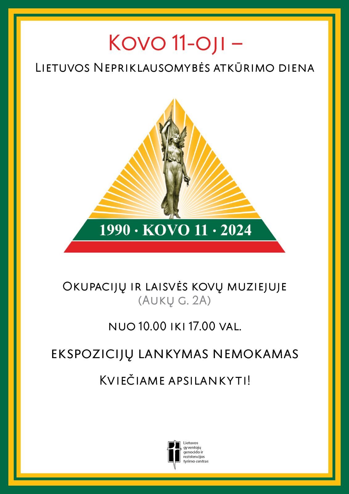 Kovo 11 d., pirmadienį, nuo 10 iki 17 val. – atvirų durų diena Okupacijų ir laisvės kovų muziejuje (Aukų g. 2A, Vilnius).