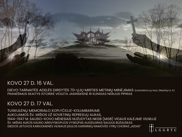 16 val. Tuskulėnų memorialo Konferencijų salėje (Žirmūnų g. 1F, Vilnius) vyks Dievo tarnaitės Adelės Dirsytės 70-ųjų mirties metinių minėjimas. Jame dalyvaus ir pranešimus skaitys LGGRTC Atminimo programų skyriaus vedėja Violeta Jasinskienė („Moterys lageriuose“) ir kunigas dr. Nerijus Pipiras („Dievo tarnaitės lietuvės kaip vilties žmonės“).