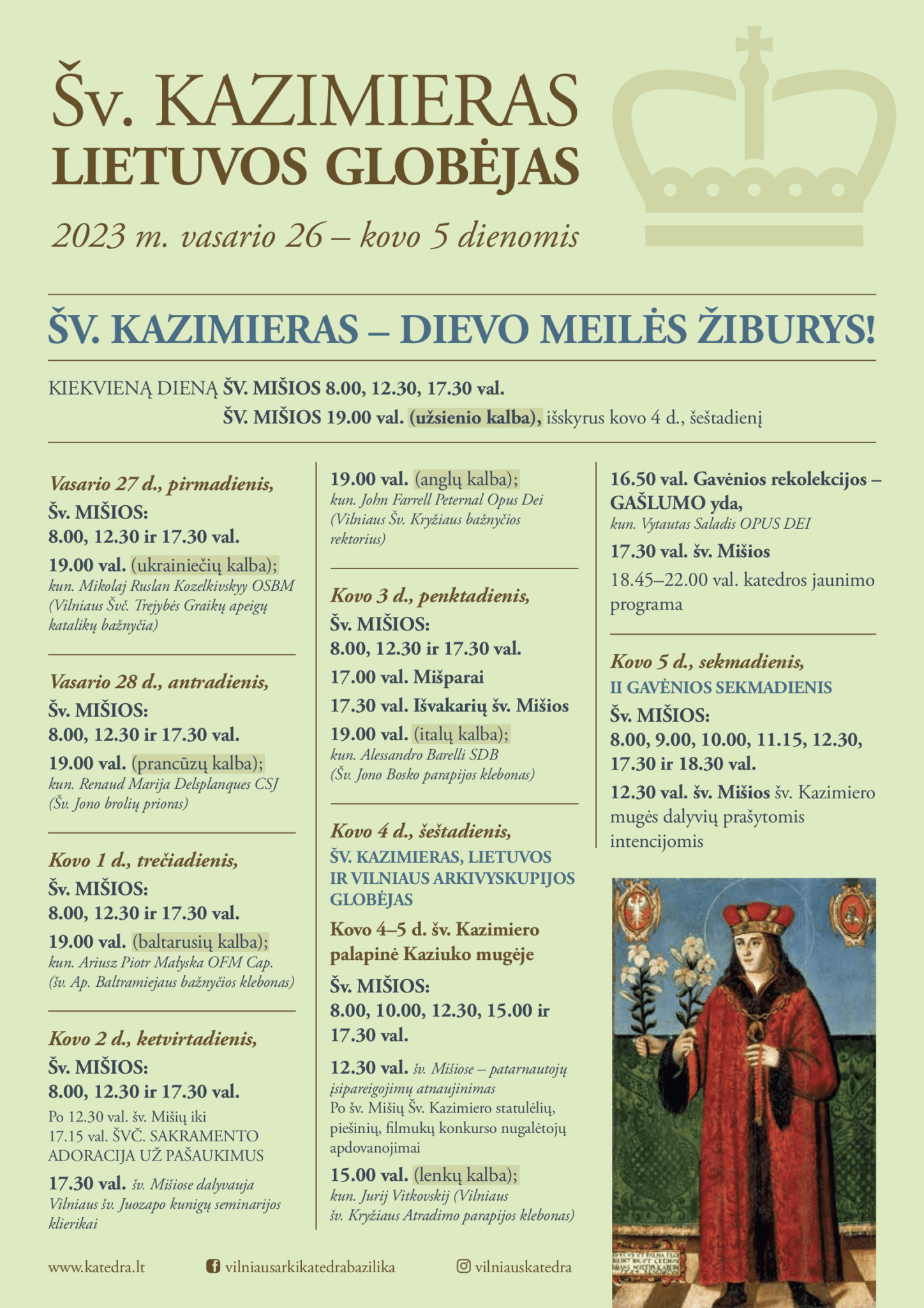 Vasario 26 – kovo 5 d. Vilniuje vyks šv. Kazimiero atlaidų šventė „Šv. Kazimieras – Dievo meilės žiburys“, į kurią kviečia Vilniaus arkikatedros bazilikos bendruomenė.