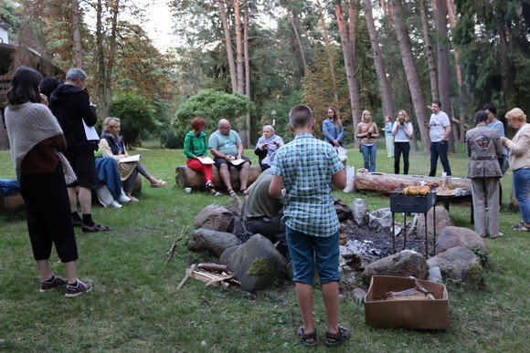Mokymai tęsėsi iki vėlaus vakaro, o po vakarienės visi susirinko prie laužo, kurį su džiaugsmu sukrovė ir kurstė dalyvių vaikai. Čia vyko diskusijos, skambėjo dainos, o kukurūzų kepimas, gaivus pušyno kvapas ir laužo šviesa leido pajusti tikrą stovyklos atmosferą.