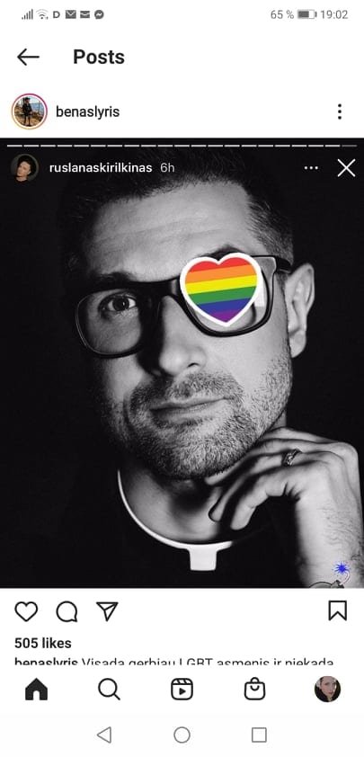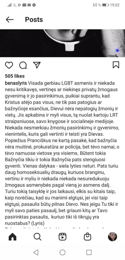 Kunigas šalia savo įrašo įkėlė ir savo nuotrauką su ant širdelės formos akinių esančia LGBT simbolizuojančia vėliava. Savo įraše kun. Benas tęsė: „Niekada nesmerkiau žmonių pasirinkimų ir gyvenimo, vienintelis, kuris gali vertinti ir teisti yra Dievas. Popiežius Pranciškus ne kartą pasakė, kad bažnyčia nėra muitinė, prokuratūra ar policija, bet tėvo namai, o tėvo namuose vietose yra visiems. Būtent tokia Bažnyčia tikiu ir tokia Bažnyčia pats stengiuosi gyventi.”
