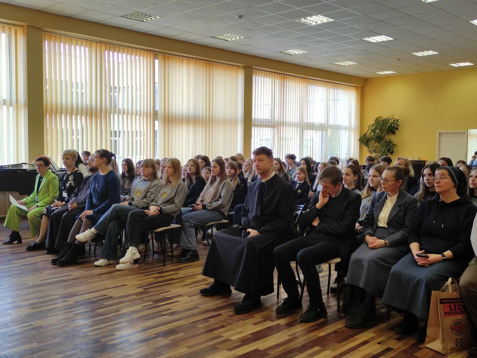 Mokinių nuoširdūs žodžiai apie gyvenimo prasmę, gerumą pynėsi su prasmingomis dainomis, giesmėmis, saksofono ir smuiko melodijomis (dėkojame mūsų partneriams – Kauno sakralinės muzikos mokyklos mokytojų komandai), svečių dovanota giesmė kvietė susimąstyti, ieškoti, vertinti.
