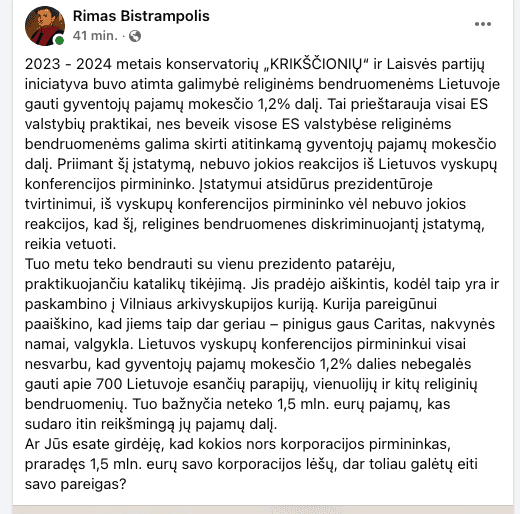 „Lietuvos vyskupų konferencijos pirmininkui visai nesvarbu, kad gyventojų pajamų mokesčio 1,2% dalies nebegalės gauti apie 700 Lietuvoje esančių parapijų, vienuolijų ir kitų religinių bendruomenių. Tuo bažnyčia neteko 1,5 mln. eurų pajamų, kas sudaro itin reikšmingą jų pajamų dalį.