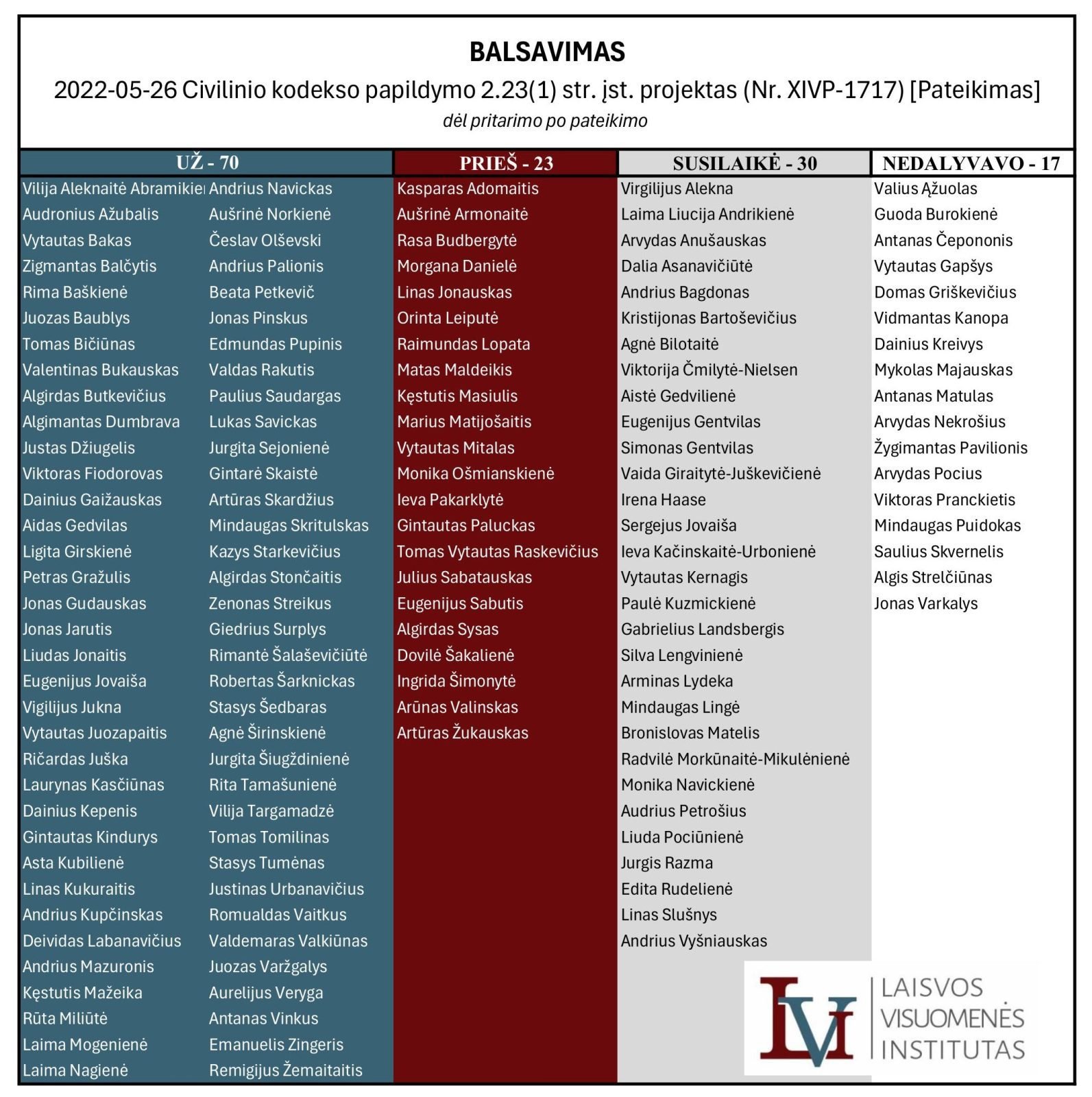 Vis dėlto, balsavime atskirąją nuomonę nesudvejojo išreikšti 9 TS-LKD frakcijos nariai A. Strelčiūnas, A. Čepanonis, V. Rakutis, A. Matulas, P. Saudargas (inicijavęs alternatyvųjį „Artimojo ryšio“ įstatymo projektą), E. Pupinis, A. Jakavonytė, J. Urbanavičius bei V. Aleknaitė Abramikienė. Paminėtinas ir L. Kasčiūnas – trečiąją vietą rinkimų sąraše užimantis konservatorių krašto apsaugos ministras – kuris, nors ir nedalyvavo balsavime dėl civilinės sąjungos, tačiau jo nepritarimas šiam projektui nėra paslaptis. Valdančiųjų tarpe balsais „prieš“ svarstant šį projektą išsiskyrė ir vadinamieji „agroliberalai“ J. Varkalys ir R. Juška, kai tuo tarpu 8 jų frakcijos kolegos bei LS ir Seimo pirmininkė Viktorija Čmilytę-Nielsen balsavo „už“. 11 LP frakcijos narių, Seime aktyviausiai pasisakančių už vienalyčių porų prilyginimą šeimai, vieningai balsavo už Civilinės sąjungos įstatymo projektą.