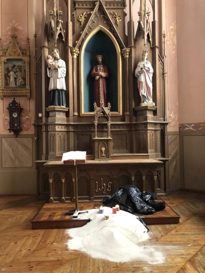 Instaliacija Leliūnų šv. Juozapo bažnyčioje advento metui – neįprasta. Iš pirmo žvilgsnio – šokiruojanti, kitokia. Ji tęstinė. Be anotacijos – sunkiai suprantama, nes advento metu bažnyčiose įprasta matyti vainiką su keturiomis žvakėmis.